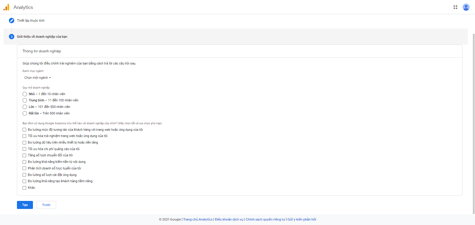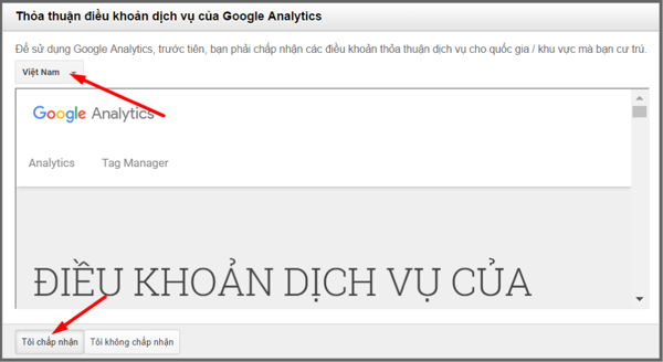 7. Chọn Tạo, lúc này hộp thoại Thỏa thuận điều khoản dịch vụ của Google Analytics, chọn Việt Nam và chọn Tôi chấp nhận.