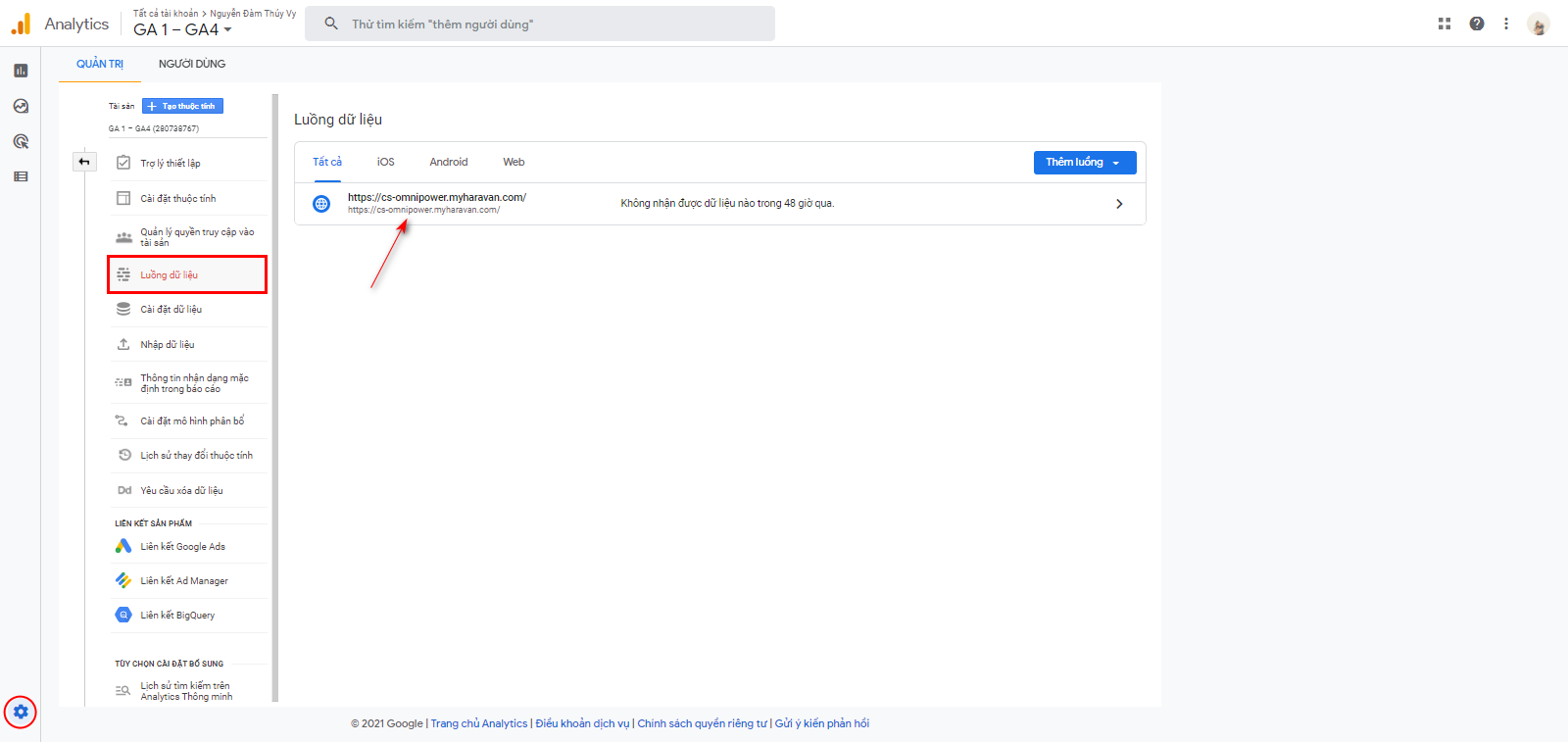 9. Tại đây, bạn mở chọn biểu tượng thiết lập -> Luồng dữ liệu -> Bấm chọn vào website bạn đã gắn ban đầu.
